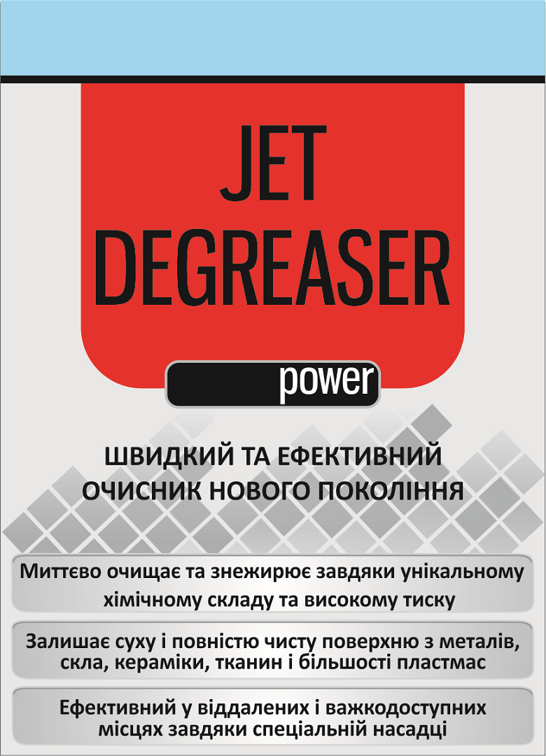 POWER JET DEGREASER – ефективний і дуже швидкодіючий аерозольний знежирювач. Завдяки інноваційним рішенням (високий робочий тиск і спеціальна вихідна насадка) POWER JET DEGREASER створює потужне розпилення на відстань понад 2 метри. Завдяки унікальному хімічному складу, POWER JET DEGREASER має можливість видалення складних забруднень: масла, жиру, клеїв, смоли, бітуму, тощо, з поверхонь металів, скла, кераміки, тканин і більшості пластмас, навіть з великої відстані. POWER JET DEGREASER особливо ефективний для знежирення важкодоступних місць. Не залишає плям та слідів під час очищення й миття поверхні. Він швидко і повністю випаровується. POWER JET DEGREASER також видаляє більшість оксидів з металевих поверхонь.